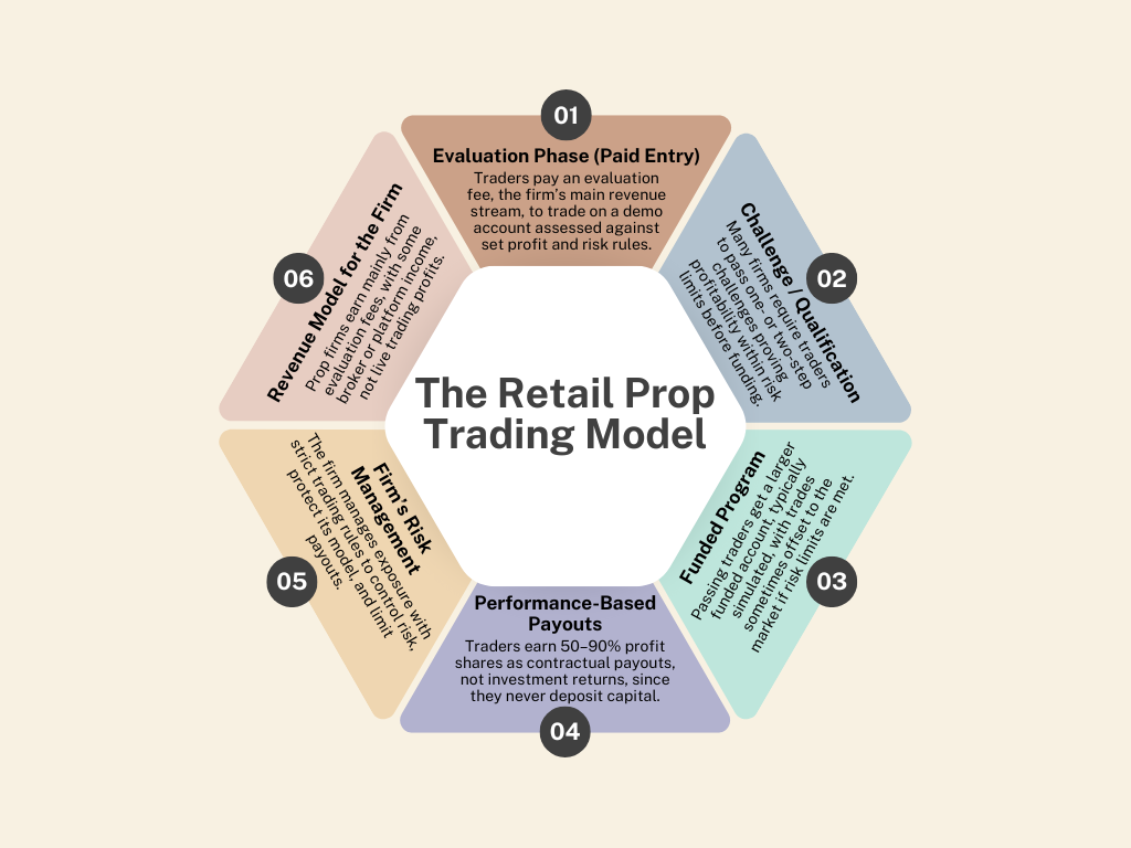 The Retail Prop Trading Model gives traders access to capital without depositing their own funds by completing a paid evaluation. Traders trade on simulated accounts and are tested against rules such as profit targets, drawdowns, and consistency requirements. Successful candidates progress to a funded account, usually still simulated but monitored through firm risk systems, with some trades occasionally offset to the live market. Profitable traders receive contractual payouts of 50%–90%, which are rewards rather than investment returns since no client money is involved. For firms, revenue mainly comes from evaluation fees, making the model scalable, predictable, and appealing to both firms and traders.