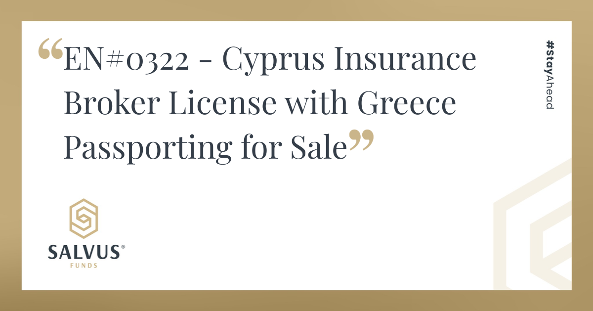 For further information on the sale of this fully licensed Cyprus insurance brokerage (Life & Non-Life) with Greece passporting, please contact our Mergers & Acquisitions team at info@salvusfunds.com. More entities for sale can be found within our Entity Acquisition or Sale service.